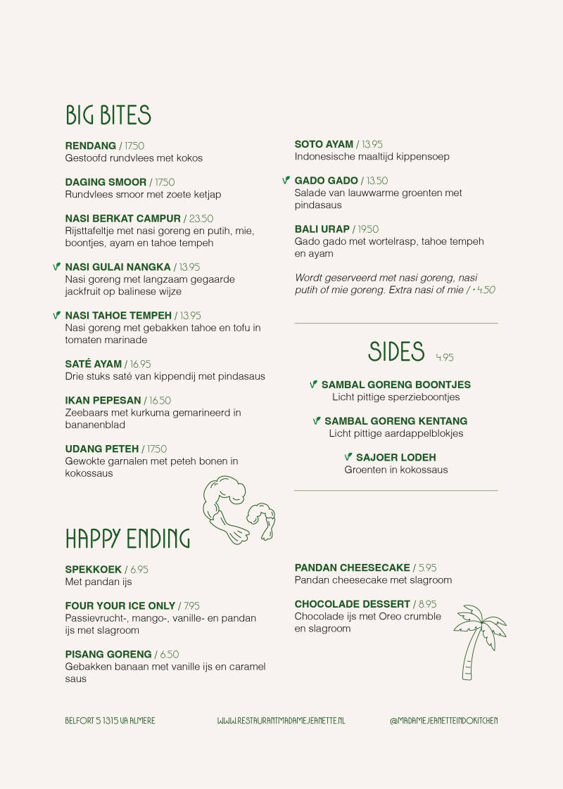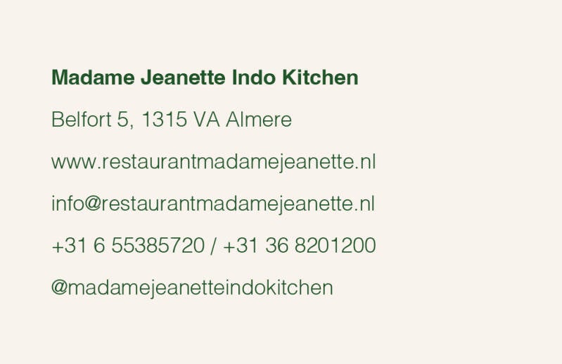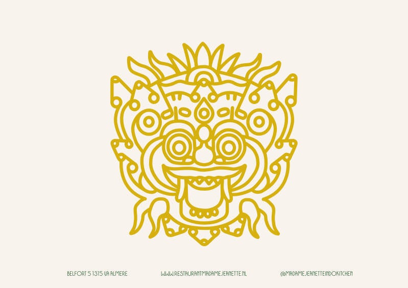 Restaurant Indo Kitchen Bar (formerly Madame Jeanette) in Almere was transitioning from a Surinamese kitchen to an Indonesian kitchen and asked me to assist with the visual identity and all the graphic work involved. There was already a clear idea of how the new branding should look. I helped bring these ideas to life, designing the logo and working on the design of elements such as the menu.